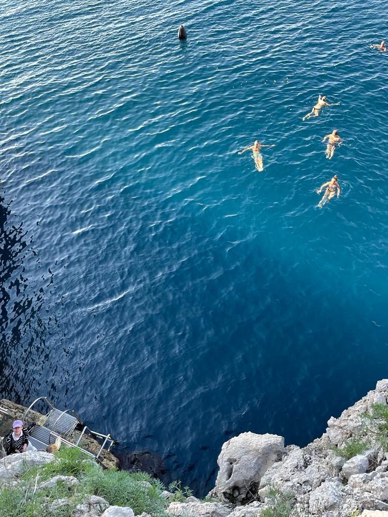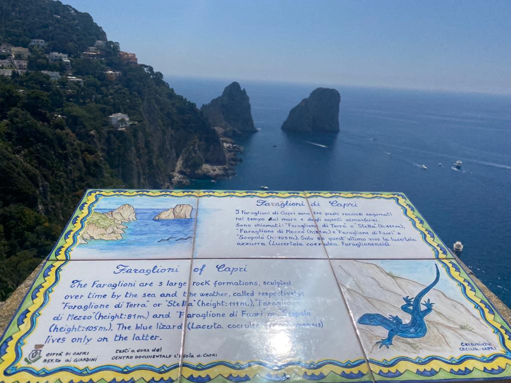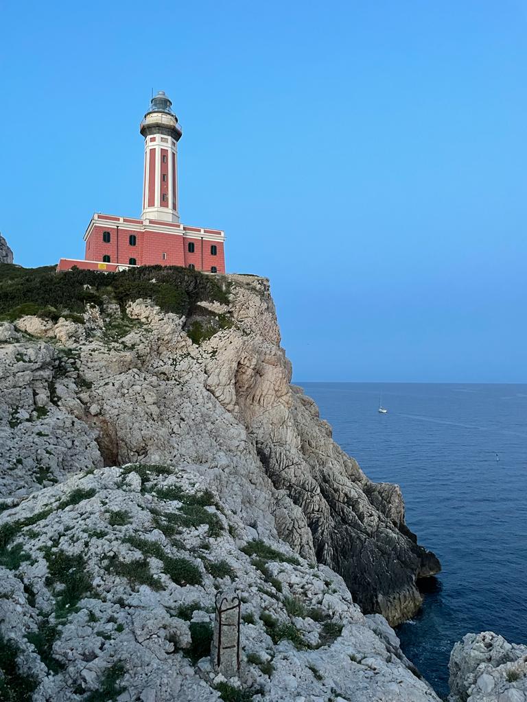 Continuiamo il tour seguendo la mappa ricevuta in dote da Antonio al momento del noleggio moto e sappiamo di doverci smarrire tra cielo e mare. Prima in seggiovia salendo verso Monte Solaro. Quindici minuti con i piedi a penzoloni tra il bianco e l’azzurro di Capri. Inebriati dai profumi che la vegetazione del Monte sprigiona, si arriva a circa 600 mt sul livello del mare dove lo sguardo non ha confini e puoi davvero “acchiappare le nuvole”. Dopo aver acciuffato il cielo con un dito, scendendo verso il mare ci si perde in un altro intenso azzurro. Anacapri è bandiera blu 2022 con il Faro di Punta Carena e Gradola, sull’altro versante anacaprese sopra la Grotta Azzurra. Autentica meraviglia della natura da visitare almeno una volta nella vita. Una delle bellezze d’Italia più conosciute e amate in tutto il mondo.