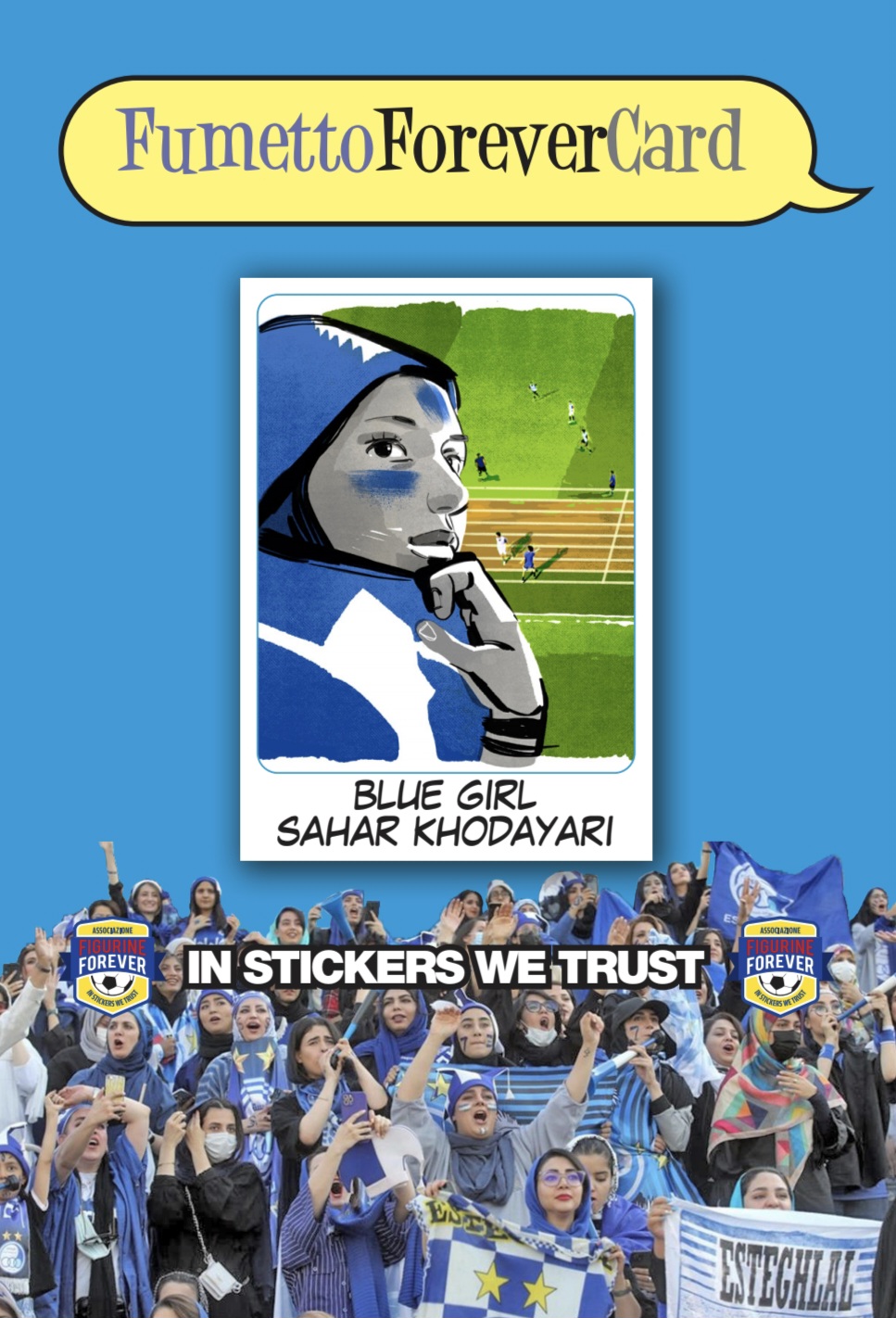 Soprattutto, però, Figucon è divenuto celebre (e a suo modo meritorio) per le figurine solidali realizzate in collaborazione con Amnesty International. In particolare, dopo le figurine di Patrick Zaki, Federico Aldrovandi e l’attivista trans Marcella di Folco, all’esposizione di quest’anno è stata presentata in anteprima la figurina solidale Fumetto Card #32 in memoria di Sahar Khodayari, la Blue Girl disegnata dalla fumettista Chiara Raimondi in ricordo della ragazza iraniana che – già molto prima delle rivolte degli ultimi mesi – fu arrestata e condannata dopo essere stata scoperta allo stadio, travestita da uomo, per poter tifare la sua squadra del cuore: l’Esteghlal FC di Teheran. E così si diede fuoco e morì. Sahar oggi rinasce come Blue Girl, la ragazza in blu, come il colore della maglia dell’Esteghlal. E proprio dal colore della divisa dell’Esteghlal nasce l’immagine della #bluegirl che farà – finalmente libera – il giro del mondo.