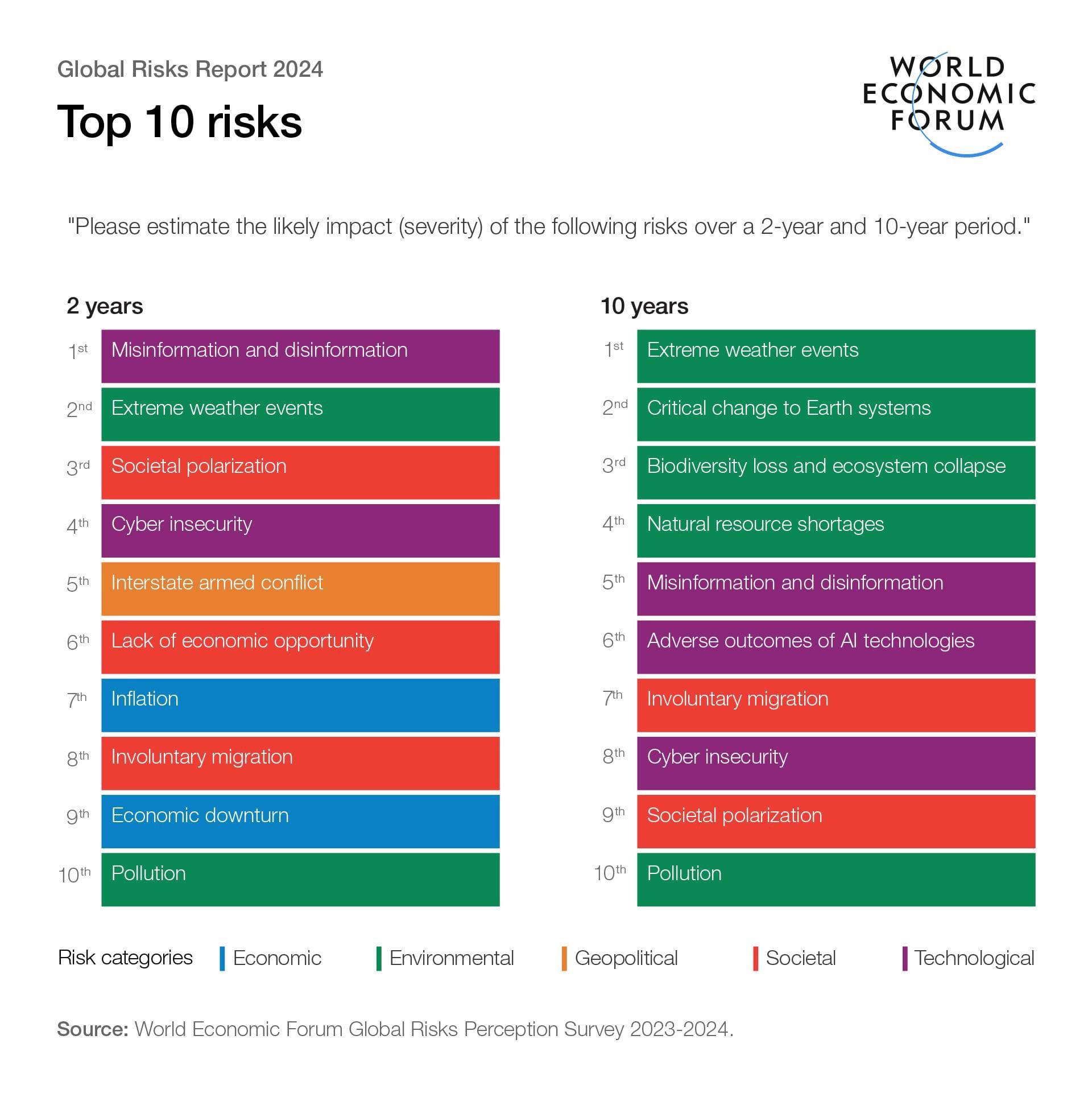 Con una prospettiva al 2026, disinformazione e misinformazione sono classificate al primo posto nel Global Risks Report: nella scorsa edizione si trovavano quindici posizioni più in basso. Nel report si legge che il rischio legato alla diffusione di fake news è probabile che diventi più acuto con le elezioni previste in diversi Paesi.