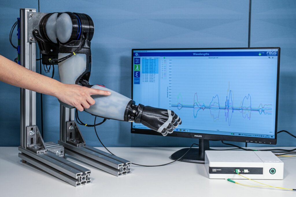 «La pelle biomimetica che abbiamo realizzato – illustra Mariangela Filosa, dottoranda dell’Istituto di BioRobotica della Scuola Superiore Sant’Anna e co-autrice dello studio – è costituita da una matrice polimerica soffice che integra sensori fotonici a reticolo di Bragg». «In questo studio – commenta Edoardo Sinibaldi, ricercatore dell’Istituto Italiano di Tecnologia, che lo ha co-supervisionato dal punto di vista scientifico – abbiamo utilizzato l’integrazione tra intelligenza fisica e intelligenza artificiale». Il posizionamento dei sensori all’interno della pelle artificiale, infatti, si basa sull’intelligenza fisica: affinché «si parlino tra loro” tramite la pelle stessa, i sensori devono essere posizionati a una certa distanza e profondità, mentre l’interpretazione del segnale prodotto dai sensori impiega l’intelligenza artificiale». Inoltre, prosegue Edoardo Sinibaldi, «per ottenere risultati più accurati dagli algoritmi di intelligenza artificiale, abbiamo usato un insieme di griglie di calcolo, come spesso viene fatto per problemi di fluidodinamica computazionale, a testimonianza del fatto che questo campo di ricerca può essere affrontato efficacemente con un approccio multidisciplinare».