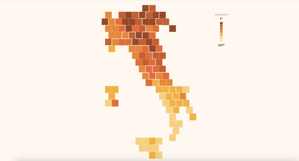 Analizzando la classifica per qualità di vita delle donne, è Siena la provincia più virtuosa. Gli indicatori considerati sono 14: dal tasso occupazionale alla percentuale di imprese femminili, dalla quota di amministratori comunali donne al numero di giornate retribuite all’anno. Da quest’anno si aggiungono la competenza alfabetica e il gender pay gap. Sul podio, anche Firenze e Perugia. Maglia nera invece per Crotone.