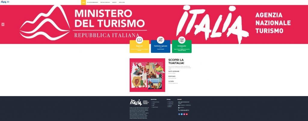 Il sito tuaitalia.it realizzato dall’Ente italiano per il turismo è dedicato alla promozione delle destinazioni turistiche italiane. Ora contiene giochi e quiz che profileranno i visitatori per comprenderne propensioni e comportamenti. Si scoprirà così quanto si conosce della Penisola e si potrà consultare materiale iconografico proveniente dall’archivio Enit  che comprende poster storici e immagini d’epoca. Le interazioni fra l’utente e le opere presenti nel sito verranno raccolte in un database che consentirà di realizzare un’indagine sui desideri dei viaggiatori.