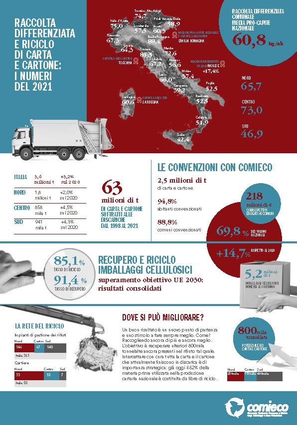 La raccolta differenziata di carta e cartone cresce positivamente in Italia: il 3,2% in più rispetto al 2020. Lo ha dichiarato Alberto Marchi, Presidente di Comieco che sottolinea: «Grazie all’azione coordinata di cittadini, Comuni e gestori, per la prima volta nel 2021, abbiamo superato i 60 chilogrammi di materiale raccolto per abitante a livello nazionale. Il Sud conferma anche nel 2021 l’aumento della raccolta differenziata di carta e cartone e il suo percorso di recupero nei confronti delle macroaree Nord e Centro con 38.000 tonnellate in più: una crescita del 4,3%, migliore di quanto fatto l’anno precedente».
