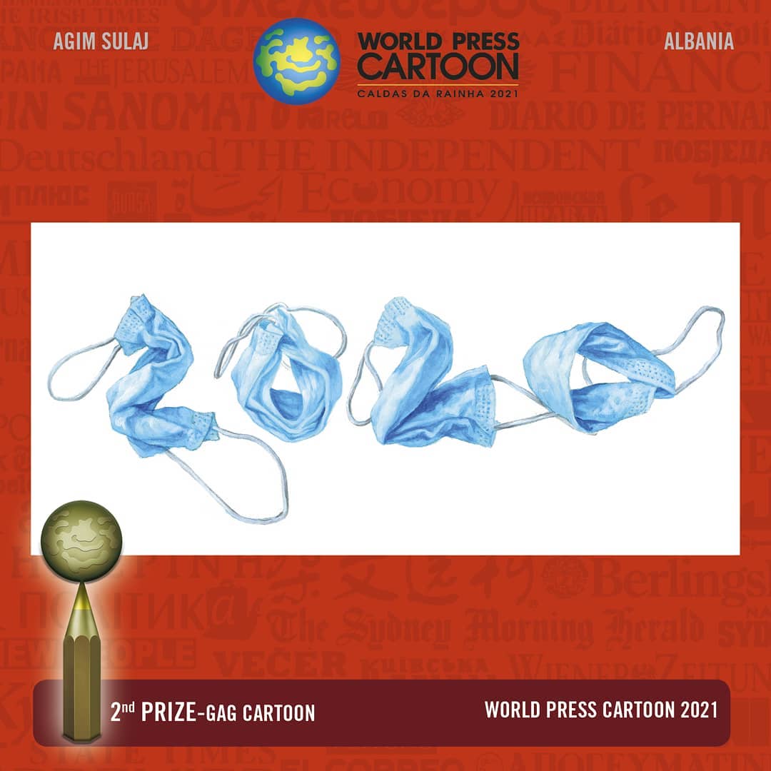 Agim Sulaj, albanese d’origine e riminese di adozione, ha riassunto l’anno in un’immagine, “2020 anno della pandemia” che gli ha fatto conquistare il secondo posto nella categoria Vignetta umoristica. L’autore narra così la genesi di quest’opera: “Stavo cercando la mia mascherina in casa, e ne ho viste tre o quattro, qui e là… In un attimo le ho guardate con occhio artistico e ho trovato uno zero. La mascherina aveva la forma di uno zero. Quindi mi sono detto: ok, disegnerò il 2020 con le mascherine, e da lì è nata subito l’idea”.