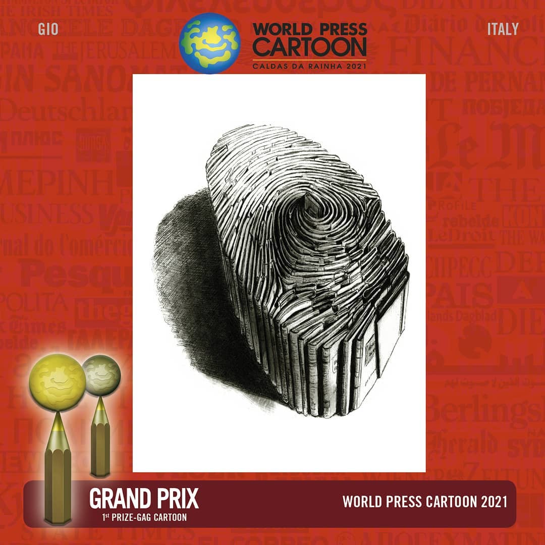 Nel 2021 World Press Cartoon torna a Caldas da Rainha – Portogallo – per disegnare un nuovo capitolo della vignetta umoristica per mano di vignettisti provenienti da tutto il mondo. Vincitrice del contest l’italiana Mariagrazia Quaranta, alias Gio,  che ha portato a casa il primo premio nella categoria Vignetta umoristica e il Gran Premio del World Press Cartoon 2021, con la sua “Impronta digitale”, pubblicata su Mundiario.